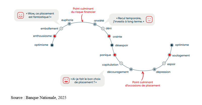 Ce graphique illustre des cycles financiers qui sont directement influencés par nos émotions. Lorsque les perspectives sont favorables, l’optimisme et même l’euphorie prennent le dessus. Mais dès qu’une correction survient ou que les attentes ne se concrétisent pas, l’anxiété et la crainte s’installent, pouvant évoluer jusqu’à la panique. Beaucoup cèdent alors à la tentation de vendre en plein creux, marquant une phase de capitulation et parfois de dépression. Heureusement, la reprise finit par pointer, ramenant peu à peu l’espoir puis le soulagement. Ce chemin émotionnel reflète la manière dont notre psychologie accompagne chaque mouvement du marché, comme illustré dans le tableau ci-dessous.
